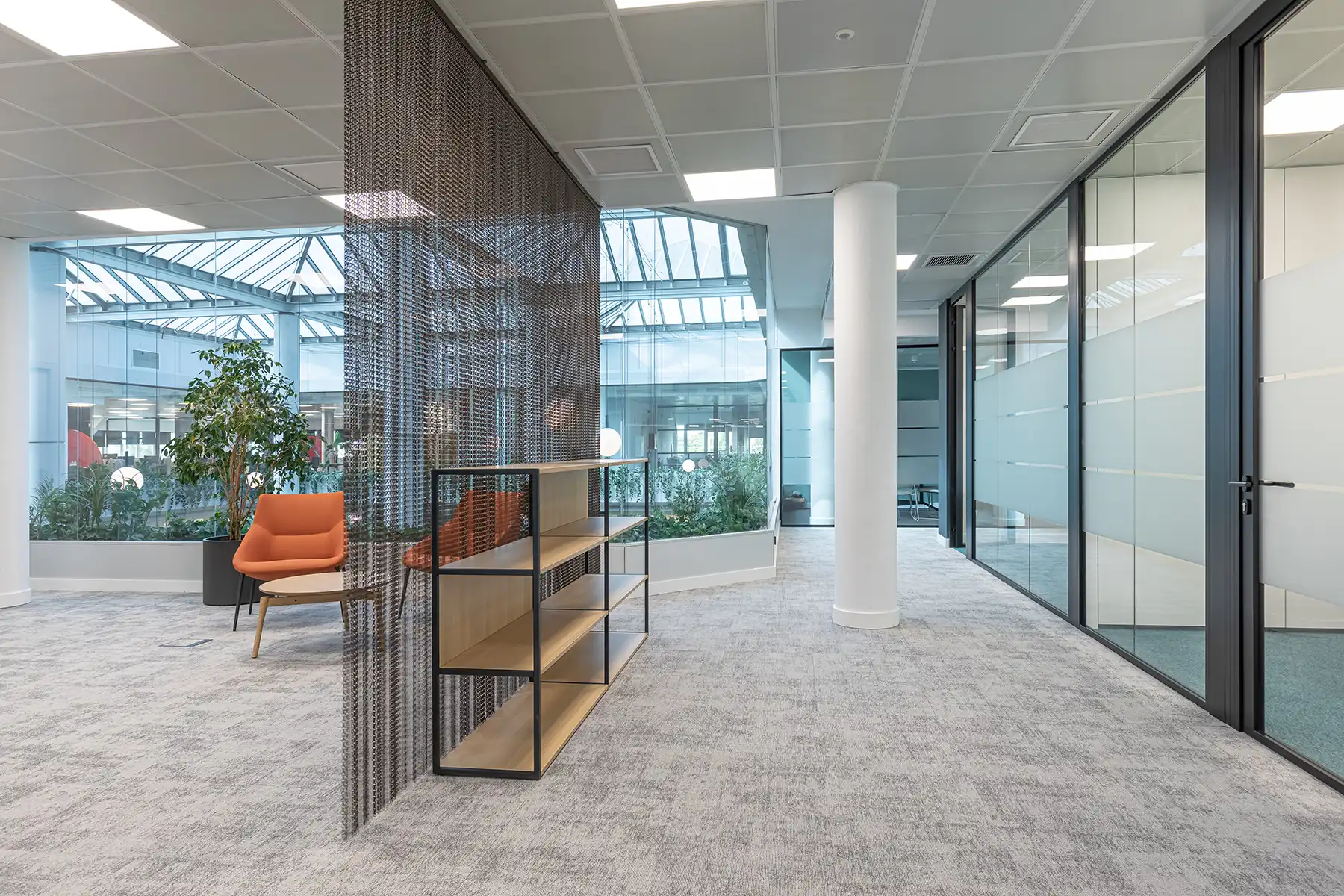 El resultado es un entorno profesional con una imagen moderna, cuidada y alineada con la identidad corporativa de la empresa, donde la rotulación se integra de forma natural en la arquitectura interior.