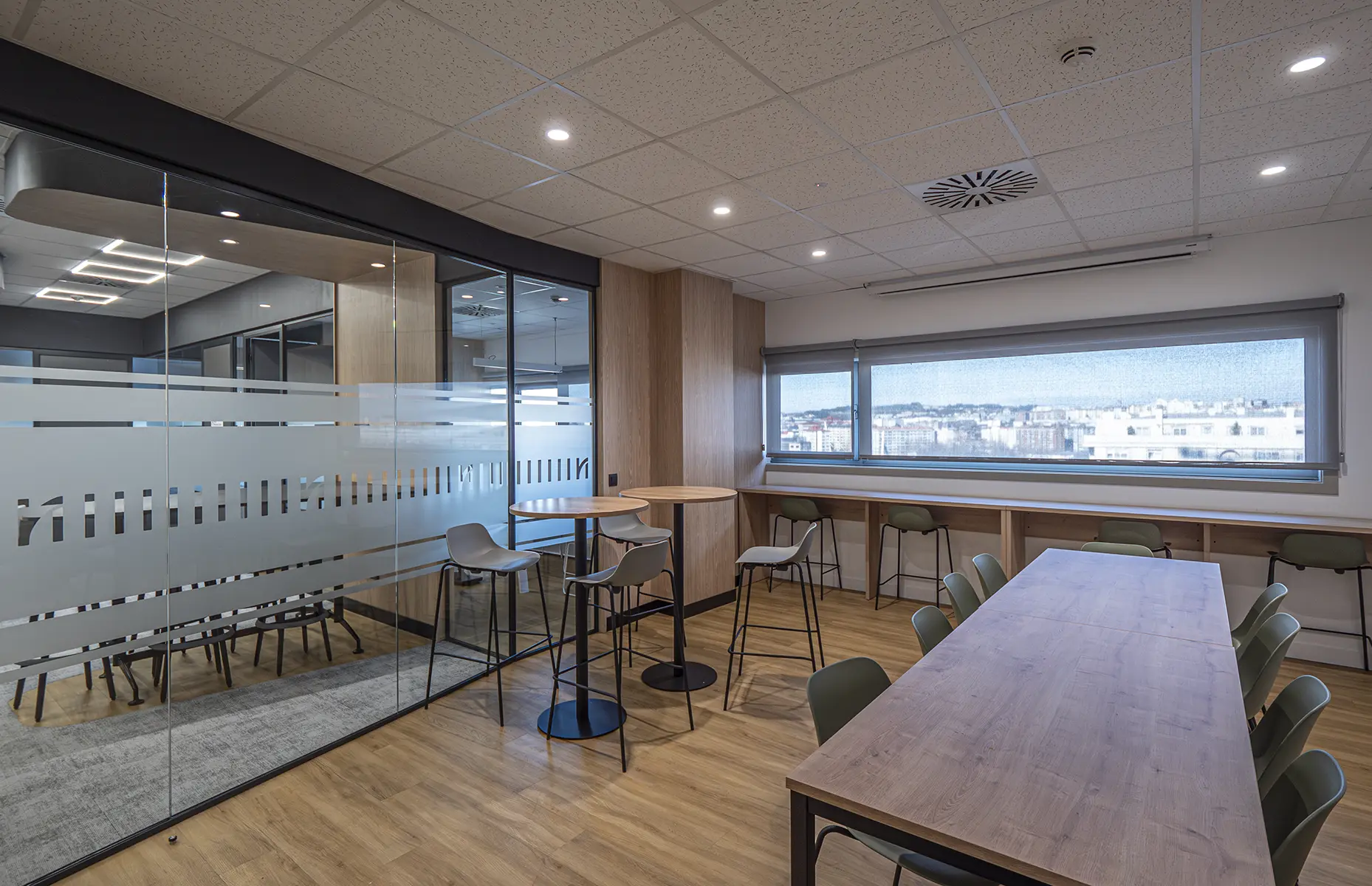 Se implementó un sistema gráfico aplicado en mamparas acristaladas que aporta continuidad visual a lo largo de las instalaciones, permitiendo modular la privacidad según las necesidades de cada zona. Además, se incorporaron elementos corpóreos de identidad en puntos estratégicos del recorrido interior, reforzando la presencia de marca dentro del entorno corporativo.